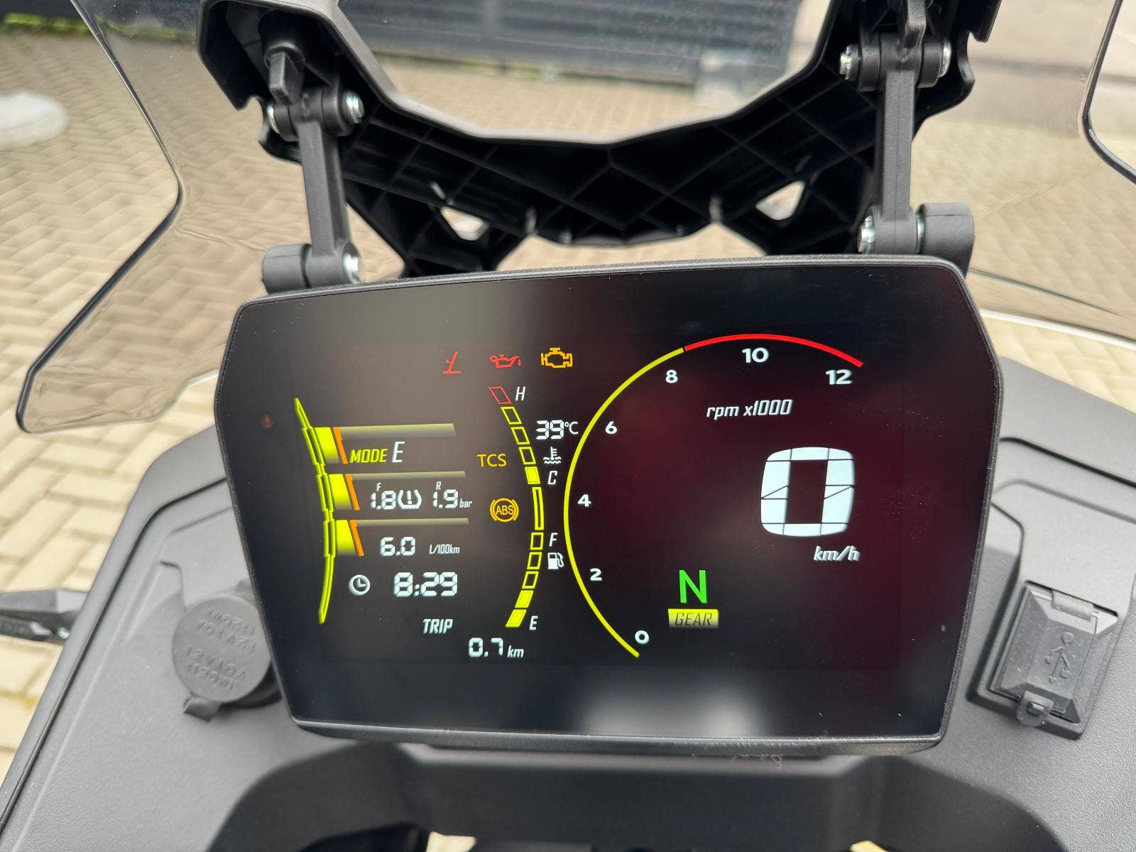 Standardní výbavou je LCD přístrojovka se 7palcovým displejem, která ukazuje krom jinýho i tlak v pneumatikách. No, a když pomocí Bluetooth spáruješ mobil, přístrojovka začne fungovat taky jako bezvadná moto navigace. Mám boční i středový stojan, konektor USB, 12V zásuvku, nastavitelný plexi, kompletní LED osvětlení a nádherný přídavný bodovky.