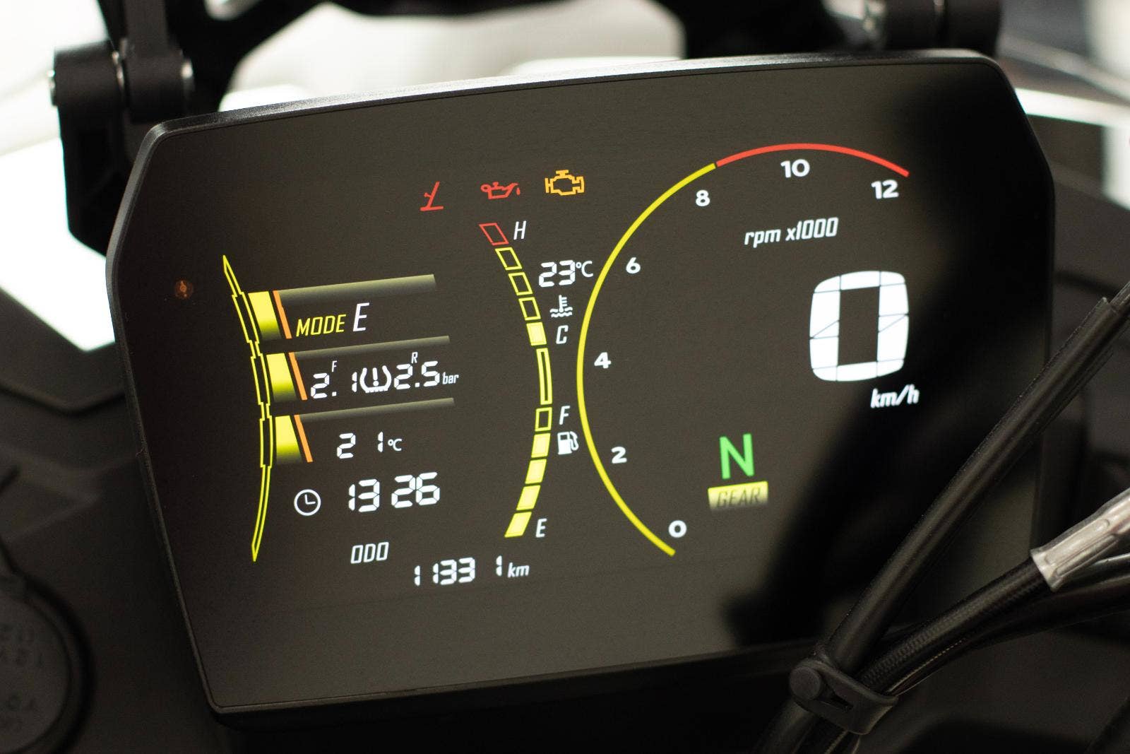 O tvůj rozhled se postará kompletní LED osvětlení a zabudovaný přídavný bodovky. Na TFT displeji uvidíš všecko, co potřebuješ – vod zařazenýho kvaltu přes spotřebu až po tlak v gumách. Když pomocí Bluetooth spáruješ mobil, přístrojovka ti naservíruje taky šipkovou navigaci.