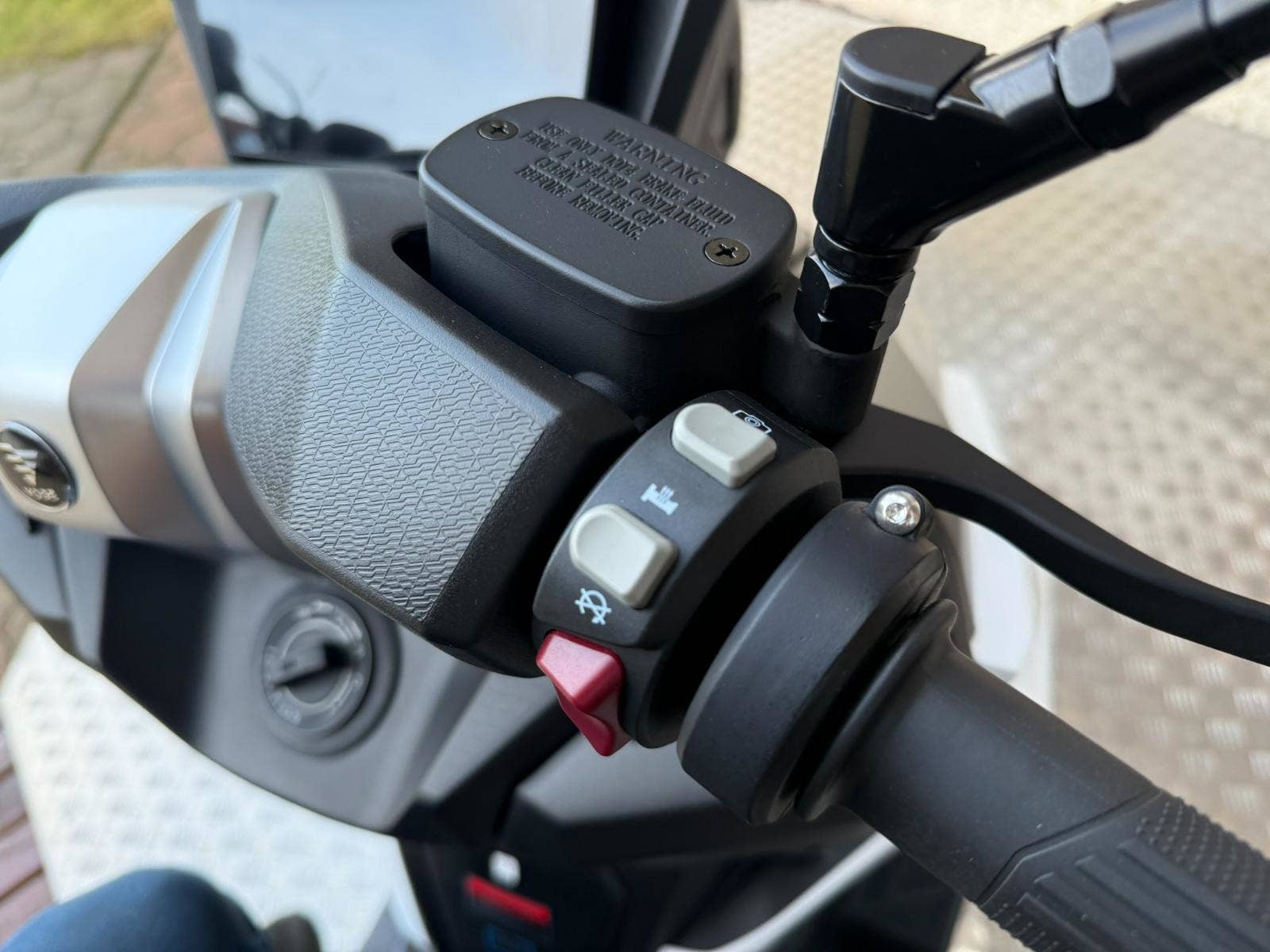 Z výbavy, kterou nabízím v základu, mají moji soupeři těžký sny. Věci jako bezklíčový startování a přístup k úložnejm prostorům berme jen jako takové oťukávání. Levý hák zasazuje nastavitelnej plexi štít, dvě přihrádky v palubní desce (jedna s USB zásuvkou) a ruční brzda.