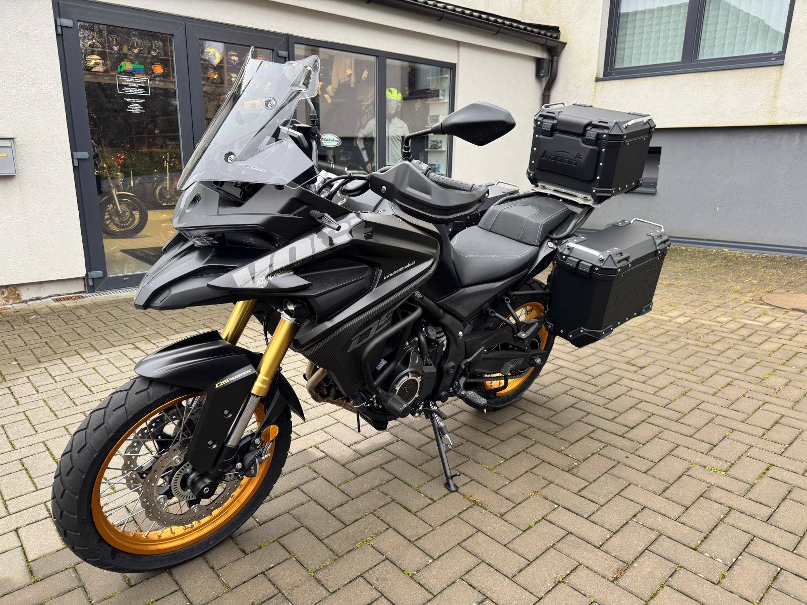 Mojí standardní výbavou je LCD přístrojovka se 7palcovým displejem, která ukazuje krom jinýho i tlak v pneumatikách. No, a když pomocí Bluetooth spáruješ mobil, přístrojovka začne fungovat taky jako bezvadná moto navigace. Mám boční i středový stojan, konektor USB, 12V zásuvku, nastavitelný plexi, kompletní LED osvětlení a nádherný přídavný bodovky. V základu dostaneš taky trojici origoš hliníkových zamykacích kufrů. Sbalíš do nich všechno, co budeme na naší cestě za poznáním potřebovat.