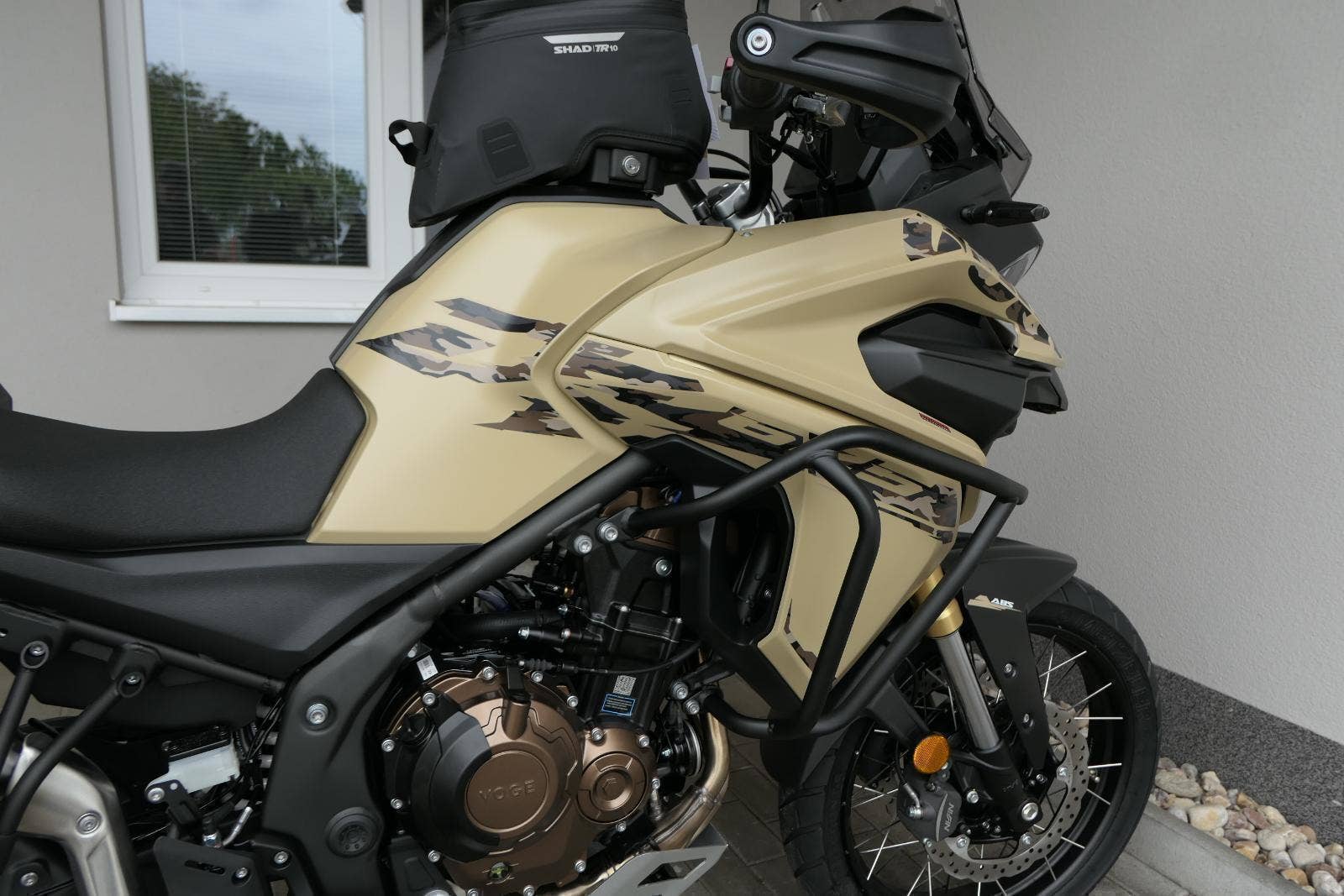 Těšit se můžeš taky na plexi, který si z místa řidiče bez nářadí nastavíš do dvou poloh. Oceníš i hliníkovej kryt motoru, LED světla včetně přídavnejch bodovek, boční i středovej stojan a hafo další výbavičky. Jo, a nově mám taky podsvícený ovladače na řídítkách, takže už žádný tápání ve tmě.