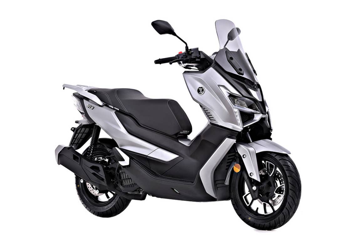Teleskopická hydraulická vidlice (ø 31 mm, zdvih 93 mm), 2× hydraulický tlumič vzadu (zdvih 103 mm). Pneumatiky 110/70-R14 vpředu, 130/70-R13 vzadu. Přední brzda – dvoupístkový plovoucí třmen, kotouč ø 240 mm. Provozní hmotnost 139 kg.