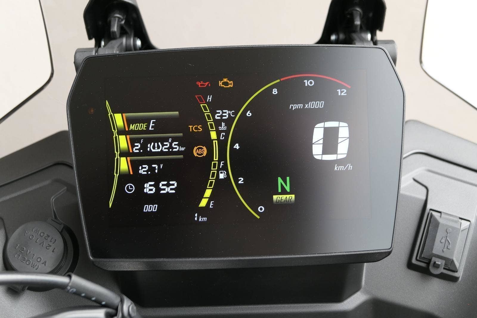Kromě větší síly a lepšího podvozku mám taky vylepšenej 7palcovej displej. Má vyšší jas, takže na něm všecko krásně uvidíš i za vostrýho slunka. Mobil si snadno spáruješ pomocí blůtůčka. Jen co to uděláš, dostaneš na přístrojovku šipkovou navigaci, díky který nemineš ani tu nejzašitější odbočku. No a 12V zásuvka nebo USB konektor? Jasněže voboje!