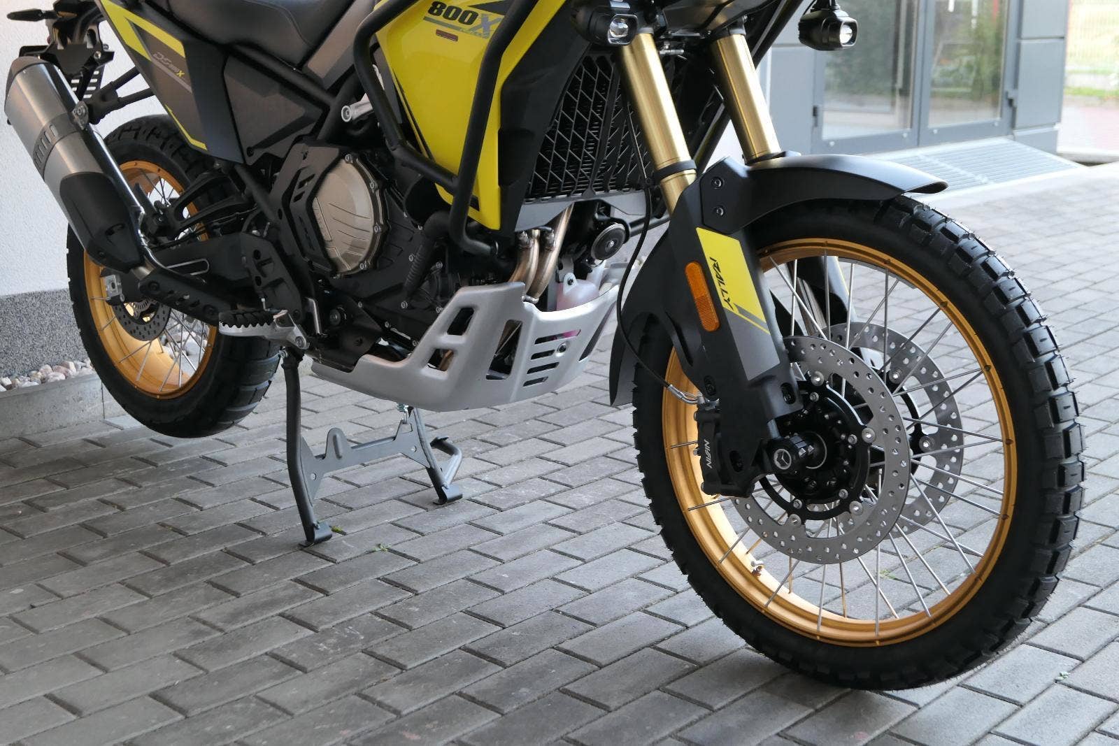 Offroadový kola jak zákon káže. Vpředu najdeš jednadvacítku, vzadu osmnáctku – prostě offroad klasika. Kola jsou samozřejmě drátový a bezdušový. Na ráfkách dostaneš gumy Pirelli Scorpion Rally STR, který si hravě poraděj jak s asfaltem, tak s terénem.