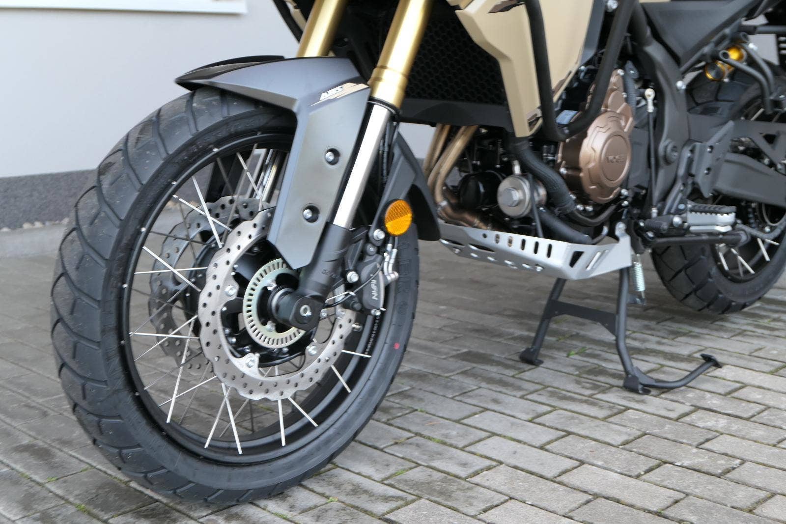 Na fešnejch drátěnejch kolech mám obutý bezdušový gumy Metzeler Tourance. Naprostej spoleh je na topový brzdy od japonskýho Nissinu. Pomocí dvou jízdních režimů mi snadno poručíš, jestli dáme piánko, nebo přitvrdíme v režimu sport.