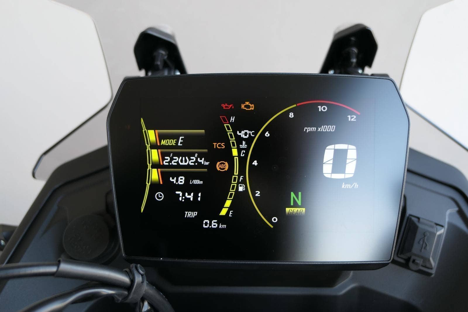 Kromě větší síly a lepšího podvozku mám taky vylepšenej 7palcovej displej. Má vyšší jas, takže na něm všecko krásně uvidíš i za vostrýho slunka. Mobil si snadno spáruješ pomocí blůtůčka. Jen co to uděláš, dostaneš na přístrojovku šipkovou navigaci, díky který nemineš ani tu nejzašitější odbočku. No a 12V zásuvka nebo USB konektor? Jasněže voboje!