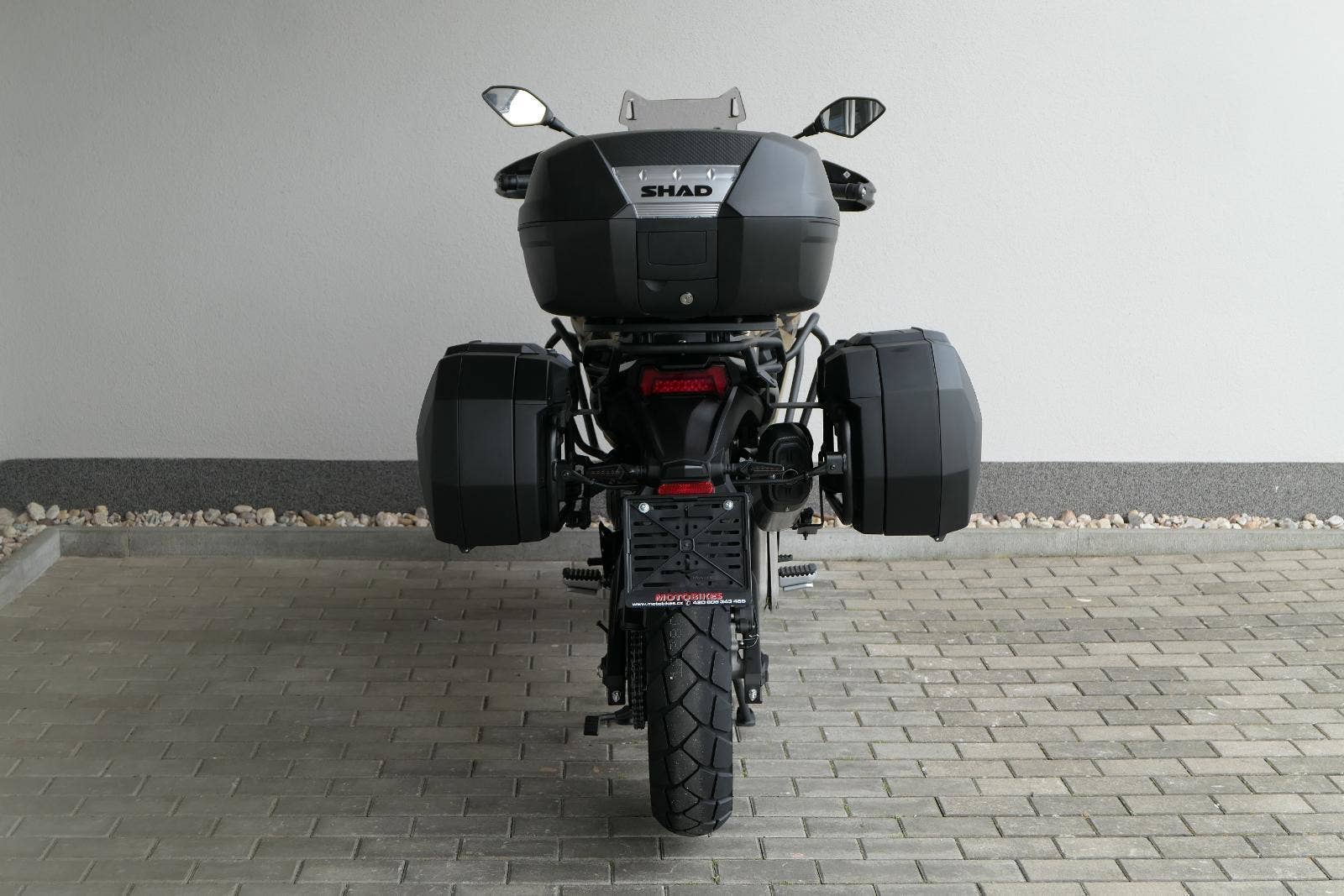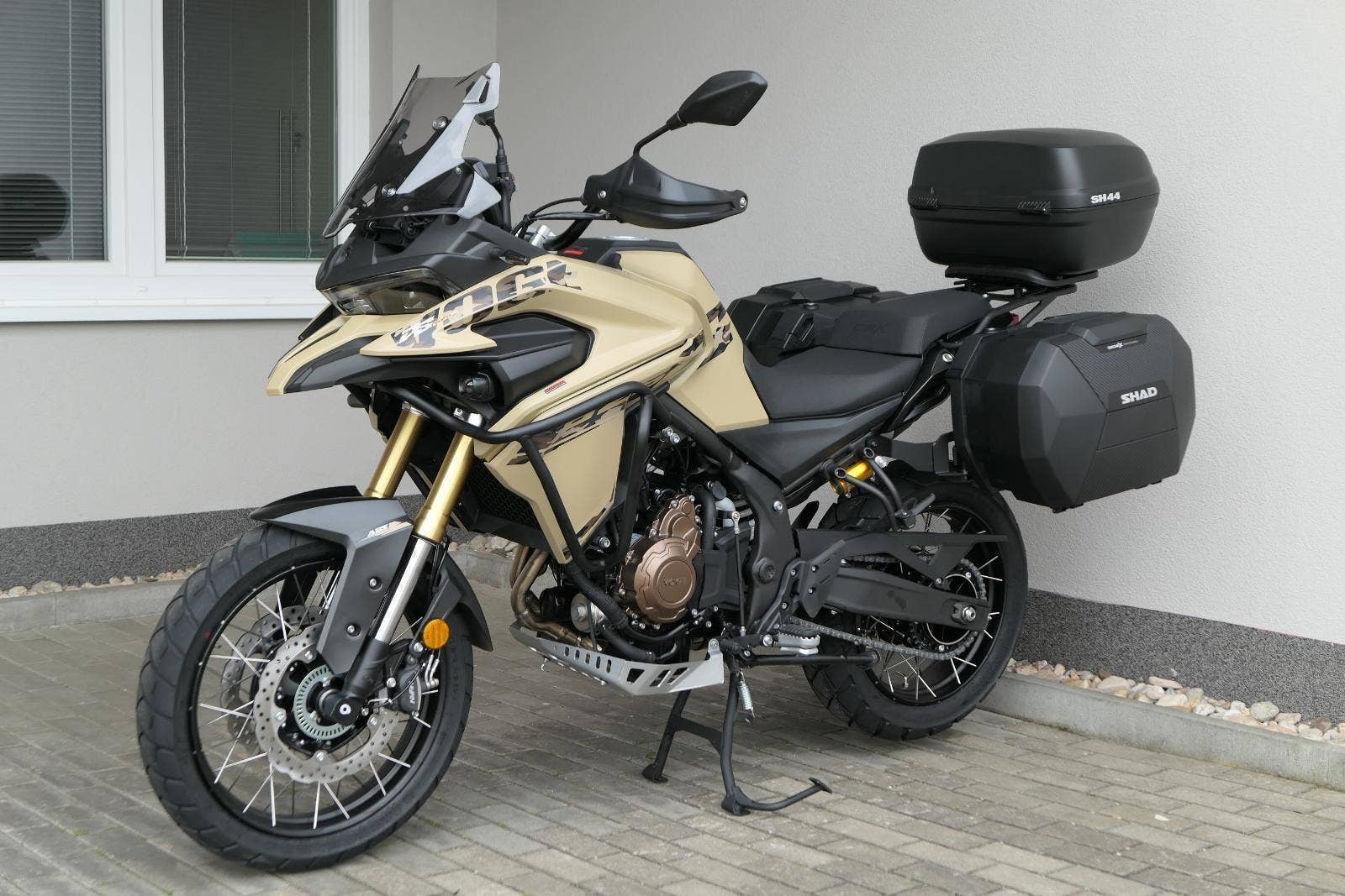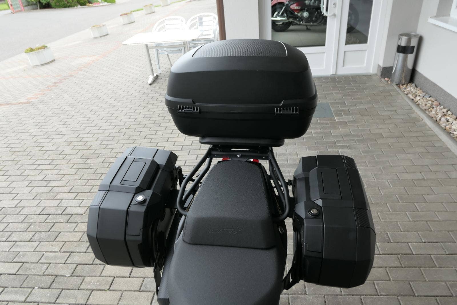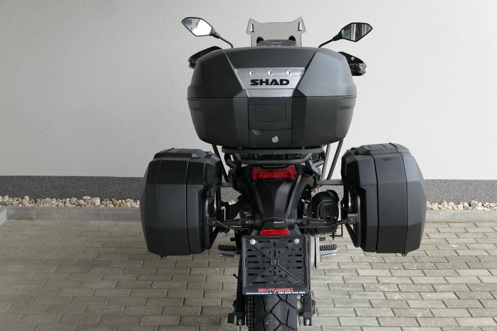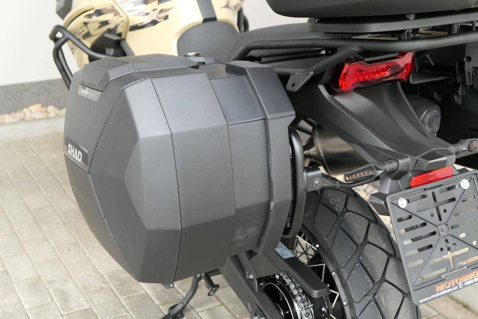 Těšit se můžeš taky na plexi, který si z místa řidiče bez nářadí nastavíš do dvou poloh. Oceníš i hliníkovej kryt motoru, LED světla včetně přídavnejch bodovek, boční i středovej stojan a hafo další výbavičky. Jo, a nově mám taky podsvícený ovladače na řídítkách, takže už žádný tápání ve tmě.
