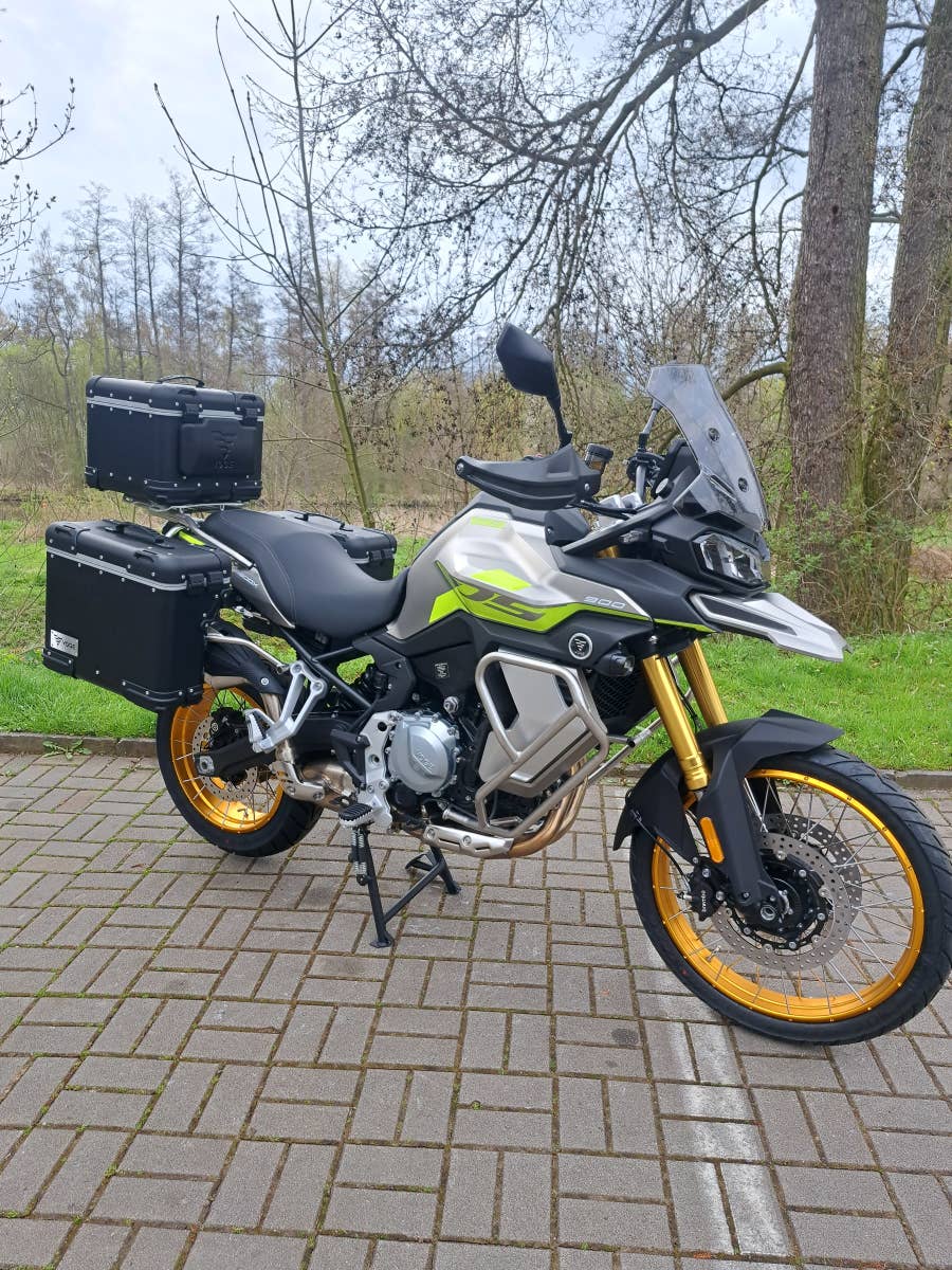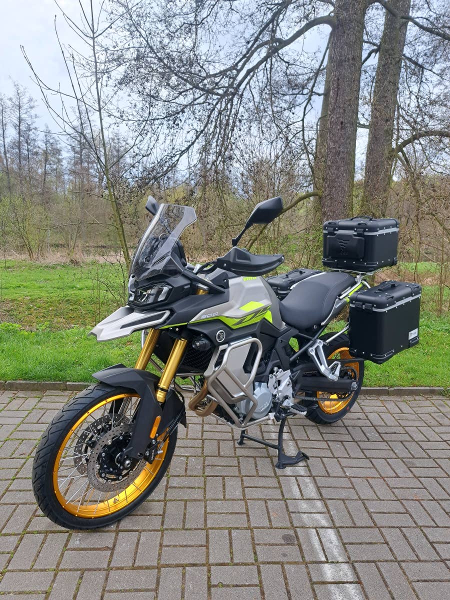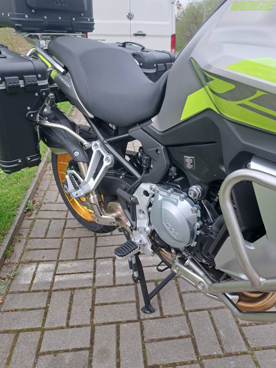 větrný štít, hlavní i boční stojan, 3x hliníkový kufr a nosiče, kryty rukou, padací rámy, kryt motoru,