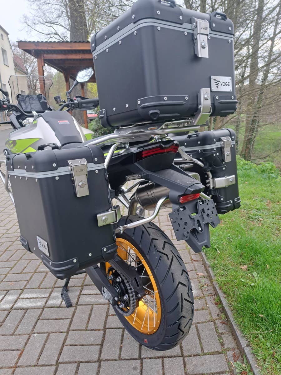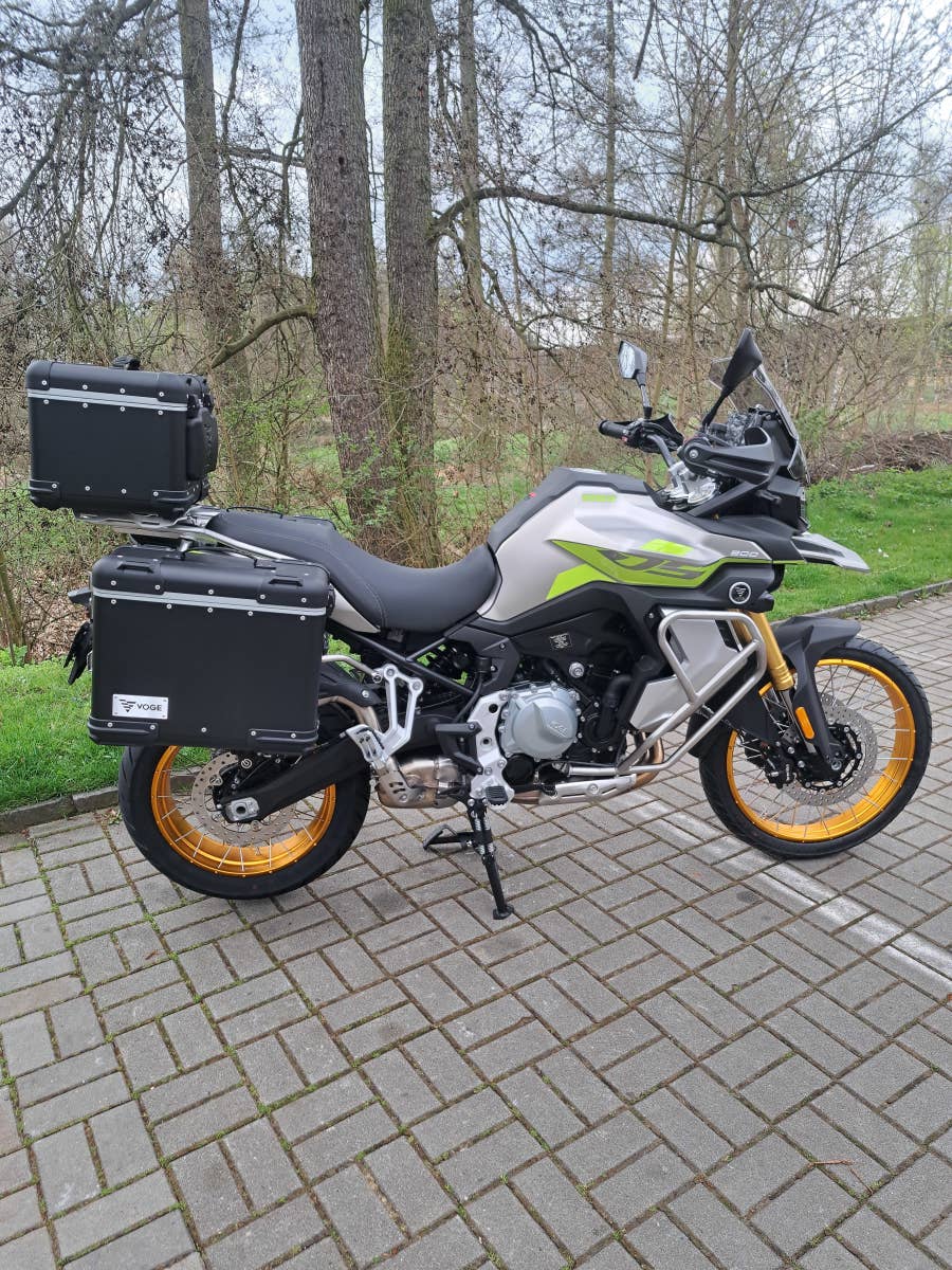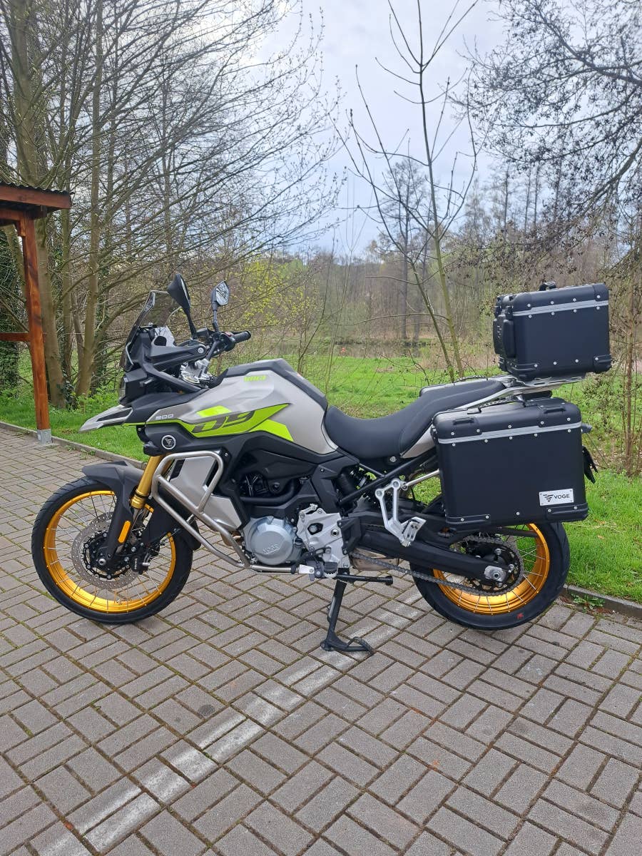 větrný štít, hlavní i boční stojan, 3x hliníkový kufr a nosiče, kryty rukou, padací rámy, kryt motoru,