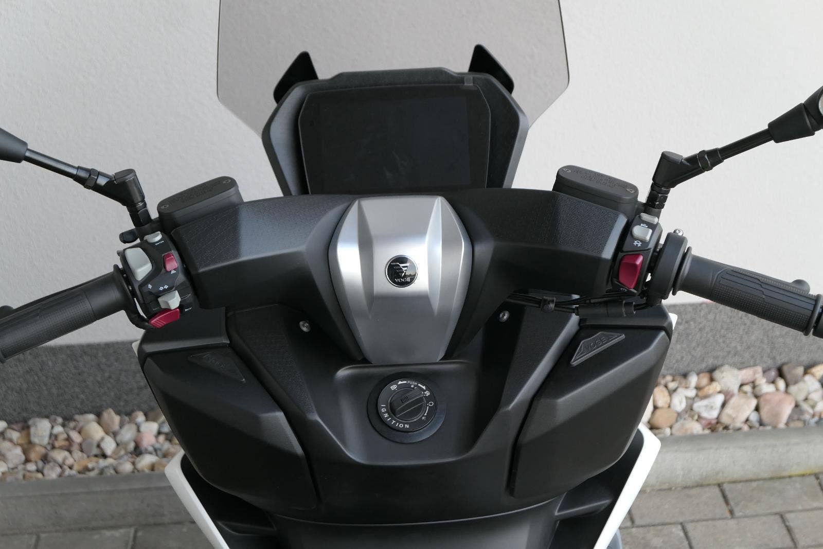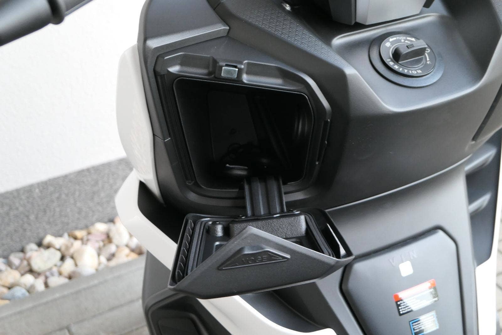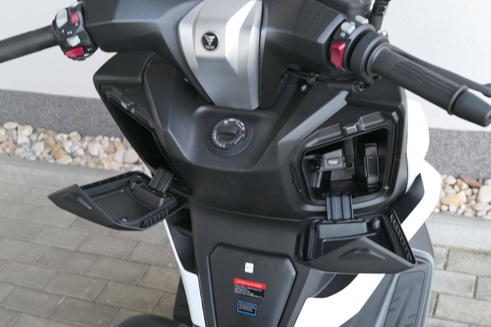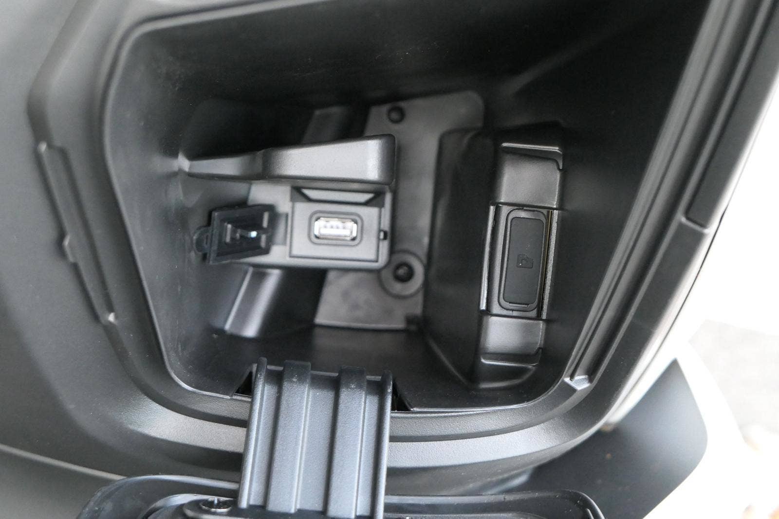 Z výbavy, kterou nabízím v základu, mají moji soupeři těžký sny. Věci jako bezklíčový startování a přístup k úložnejm prostorům berme jen jako takové oťukávání. Levý hák zasazuje nastavitelnej plexi štít, dvě přihrádky v palubní desce (jedna s USB zásuvkou) a ruční brzda.