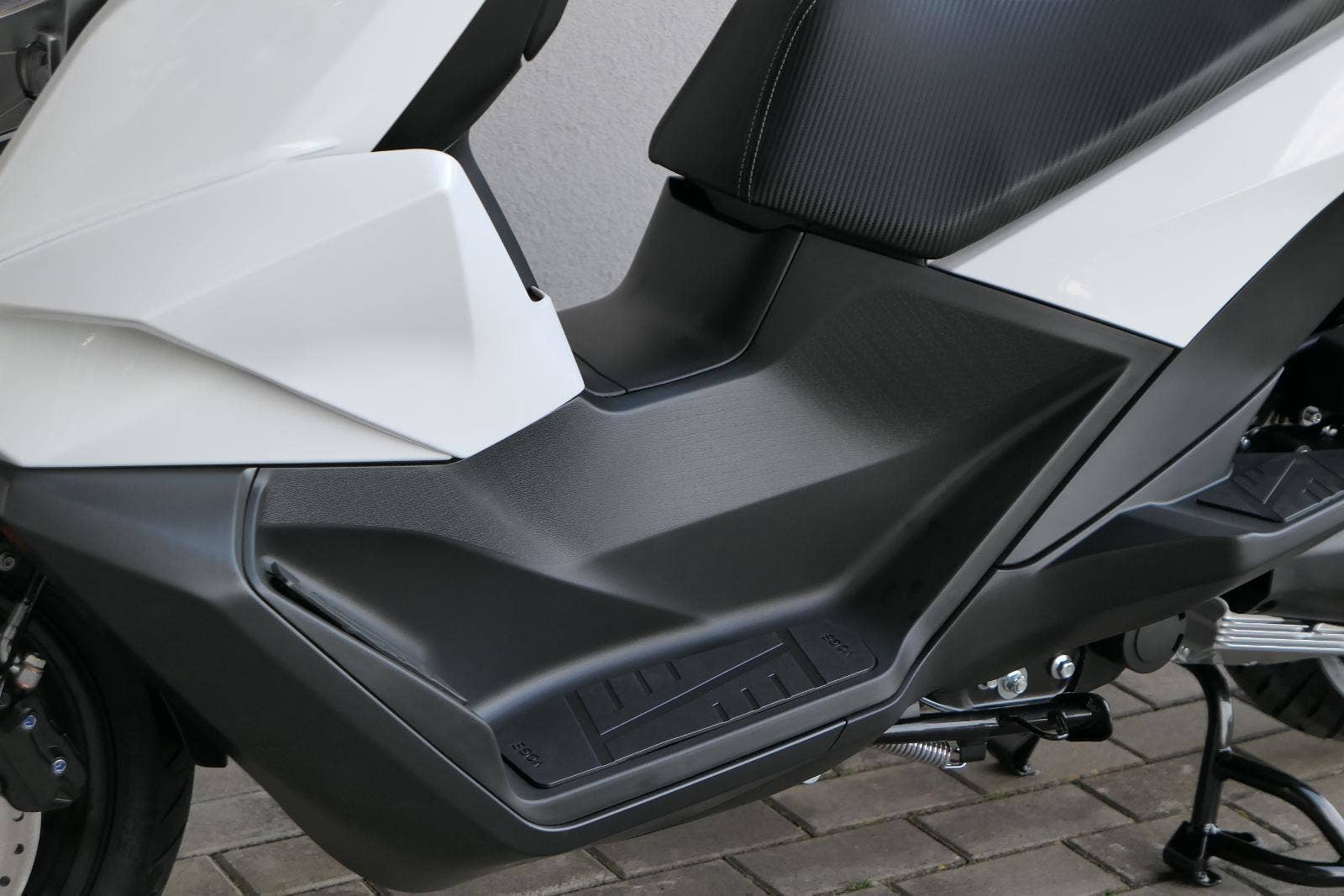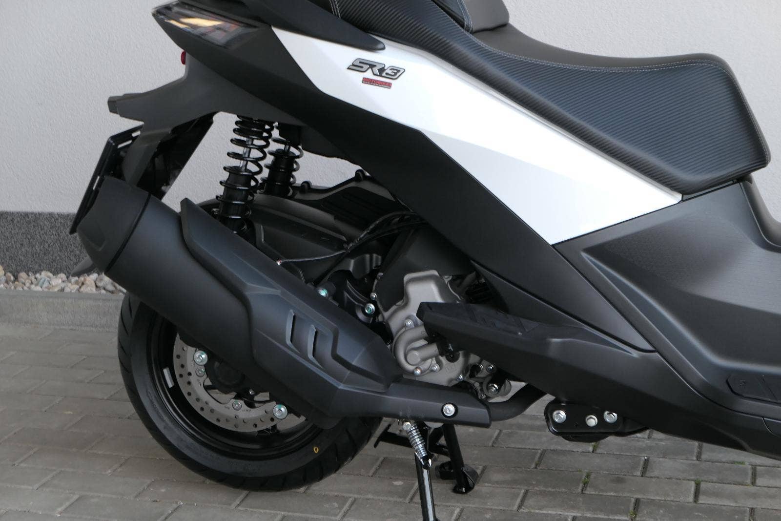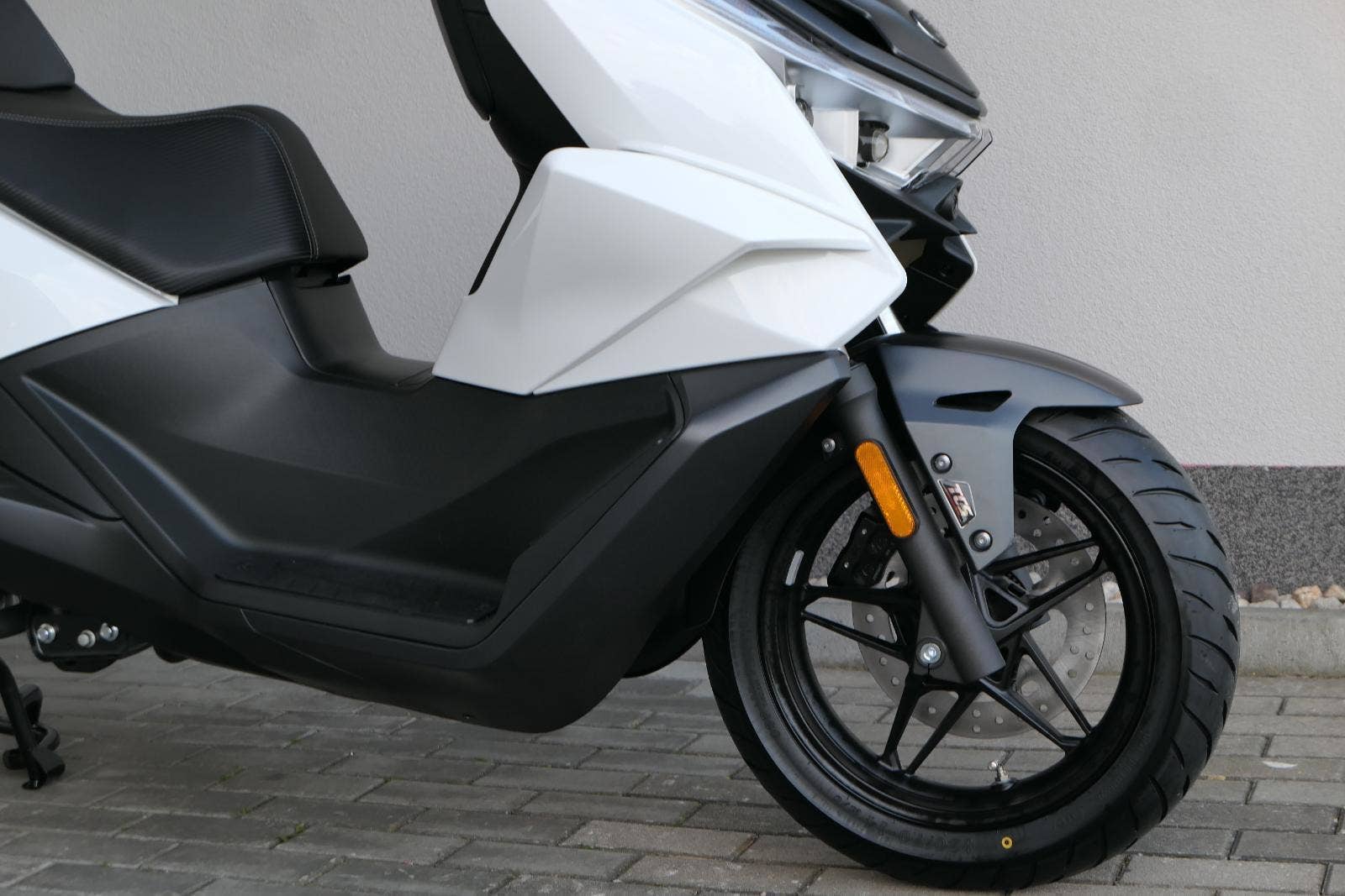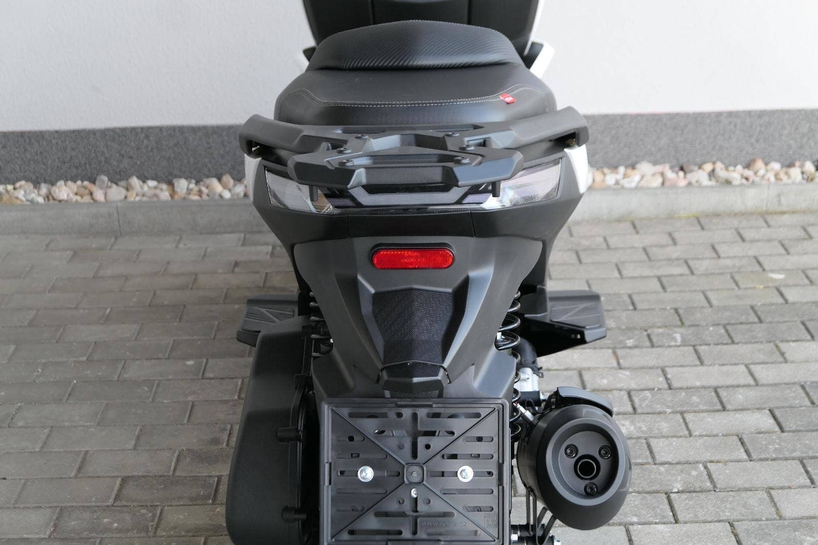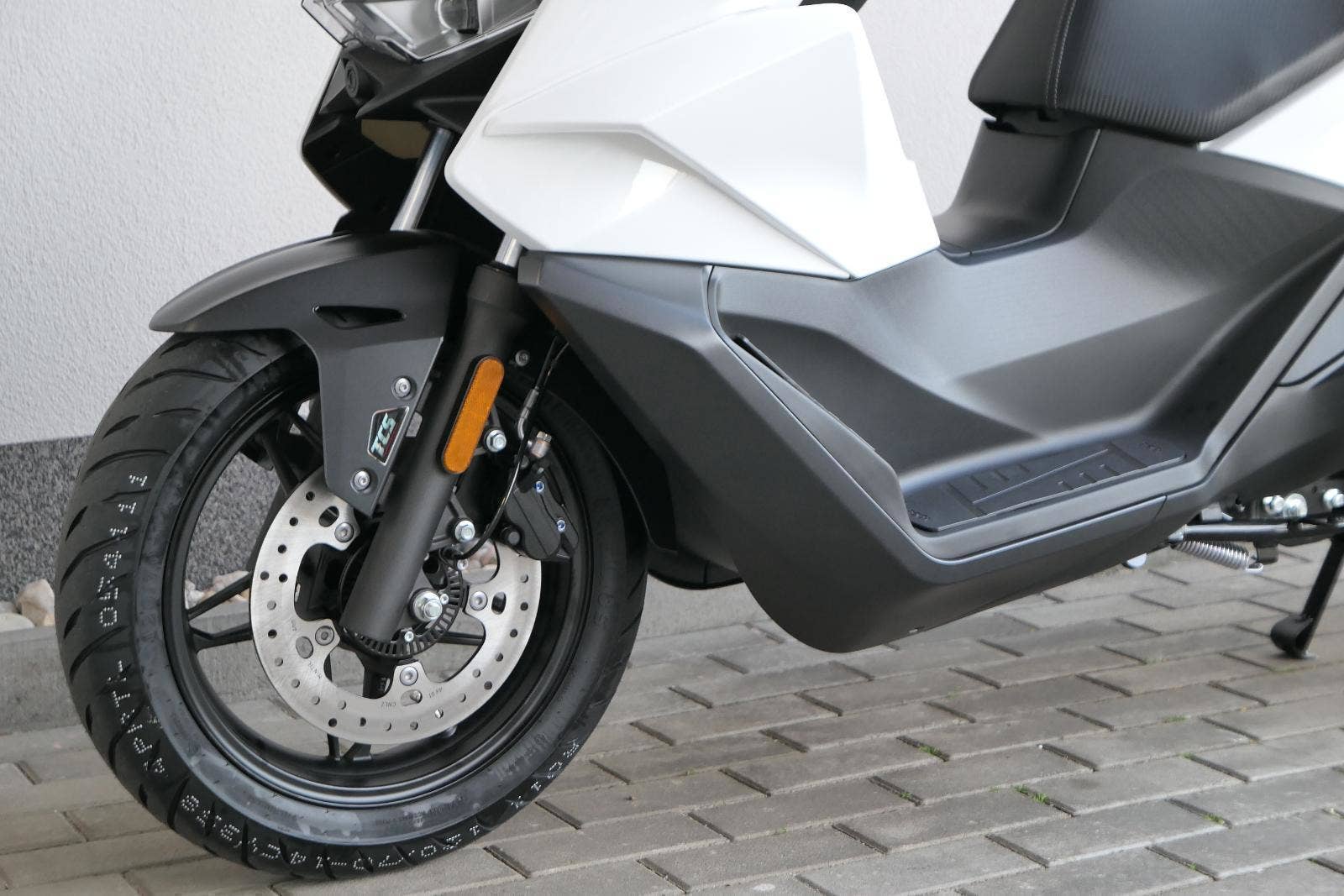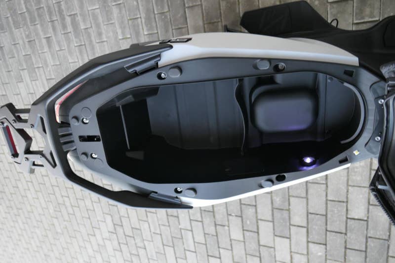 K tomu integrovaná palubní kamera s detektorem nárazu, kterej automaticky uloží záznam při nehodě. Elektrika je fajn, ale při brzdění spolíhám na starý dobrý železo, tedy dvoupístkový třmeny a kotouče. Ten vpředu má průměr 260 mm, zadní 240 mm. Na skútr slušný, co říkáš?
