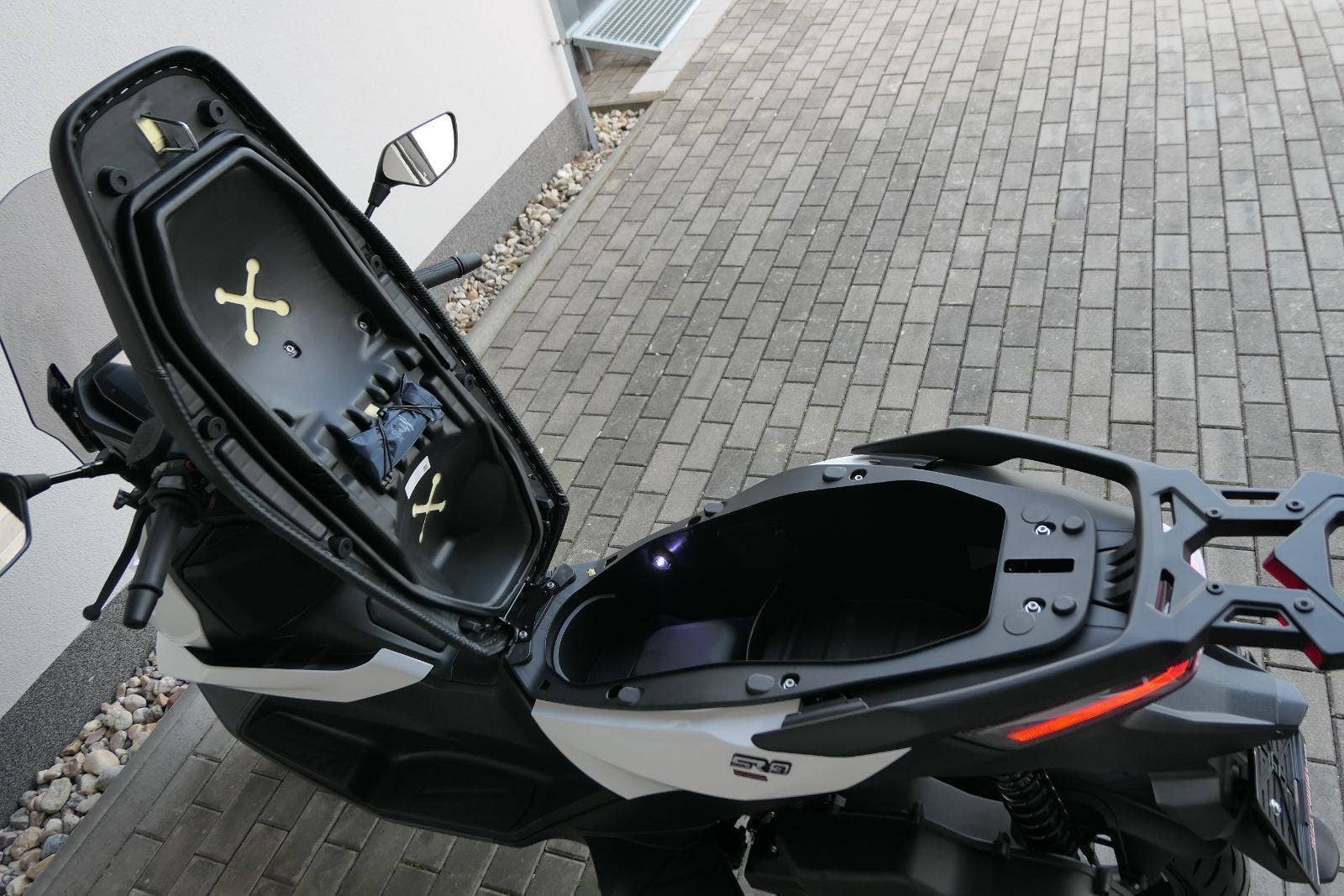 Pravým direktem kontruje osvětlenej prostor pod sedlem s místem až na dvě helmy. Do provazů konkurenci zatlačí propracovanej vysokokontrastní 7" TFT displej s turn by turn navigací, senzorem tlaku v pneumatikách a kompletní bluetooth konektivtou. Definitivní K. O. zasadí vyhřívaný rukojeti řídítek. Jedna, dva, tři… odpočítáno.