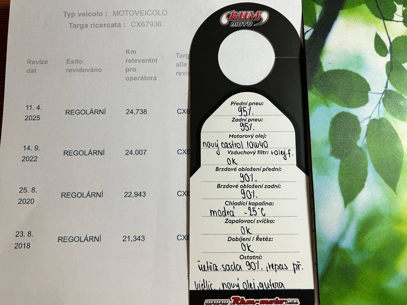 Po servisní kontrole – nový olej, filtry, gufera a olej předních vidlic, zánovní pneu, brzdové desky a řetězová sada.