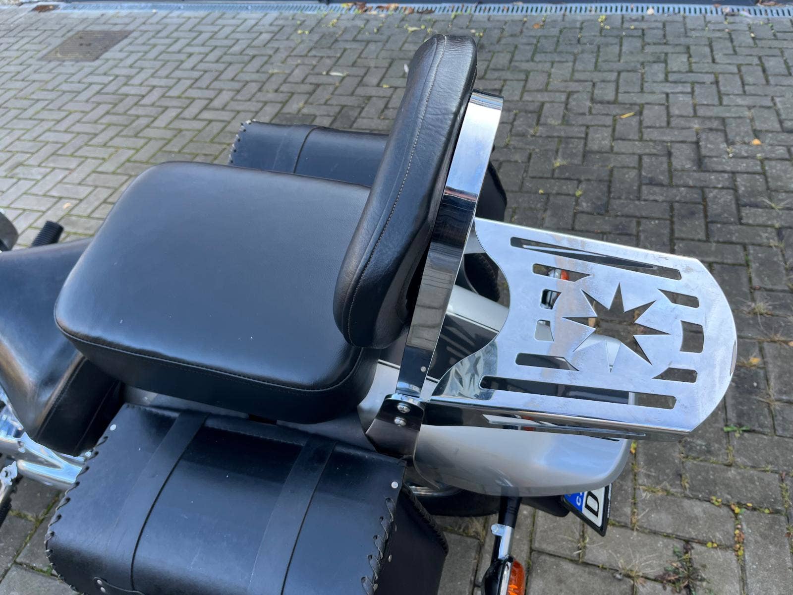 Yamaha XVS 1100 Dragstar, 1. registrace 2003, najeto 62.000 km, výkon 45 kW, velmi pěkný stav jak po technické, tak vizuální stránce, moto kupované nové v ČR, STK do 2/2029, velmi pěkná výbava - kožené brašny, zakázkové sedlo spolujezdce, padací ochraný rám motoru, velké plexi, laděný výfuk se super zvukem + originál, bez dalších investic.