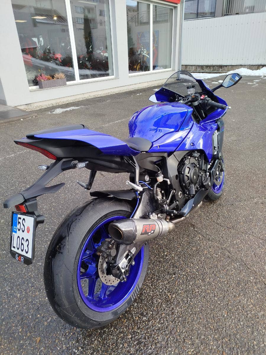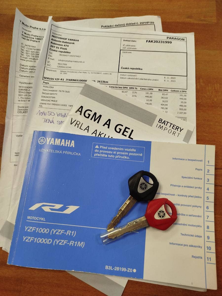 Nabízíme k prodeji krásný motocykl Yamaha YZF-R1 z roku 2023 a nájezdem 16 740 km. Motorka zakoupena nová v ČR nyní druhý majitel. 3x klíč k motocyklu, uživatelská příručka v češtině. Pravidelný servis. Nyní cca 300 km zpátky preventivní kontrola ventilů, svíčky, olej, olejový filtr, vzduchový filtr, řetězová sada, 100 km zpátky nové pneumatiky, nová baterie. Nadstandardní výbava čítající: laděný výfuk RP Tuning (originální k motorce), přepákování, kryty motoru, padací protektory, karbonový kryt kyvné vidlice, víčko nádrže.
