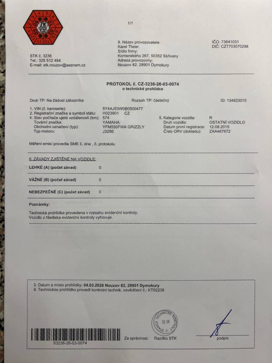 Yamaha Grizzly 550 FI - stavově nová čtyřkolka vyrobená ještě v Japonsku, nevyužité-po celou dobu jeden majitel, české TP.