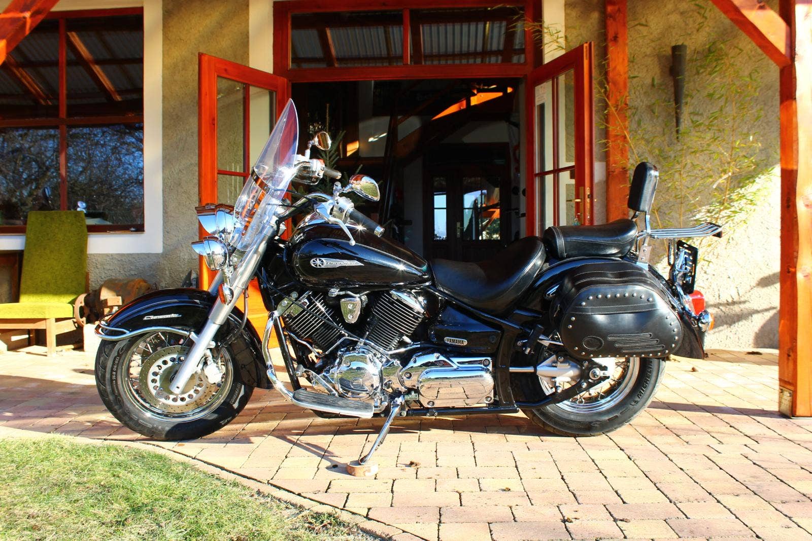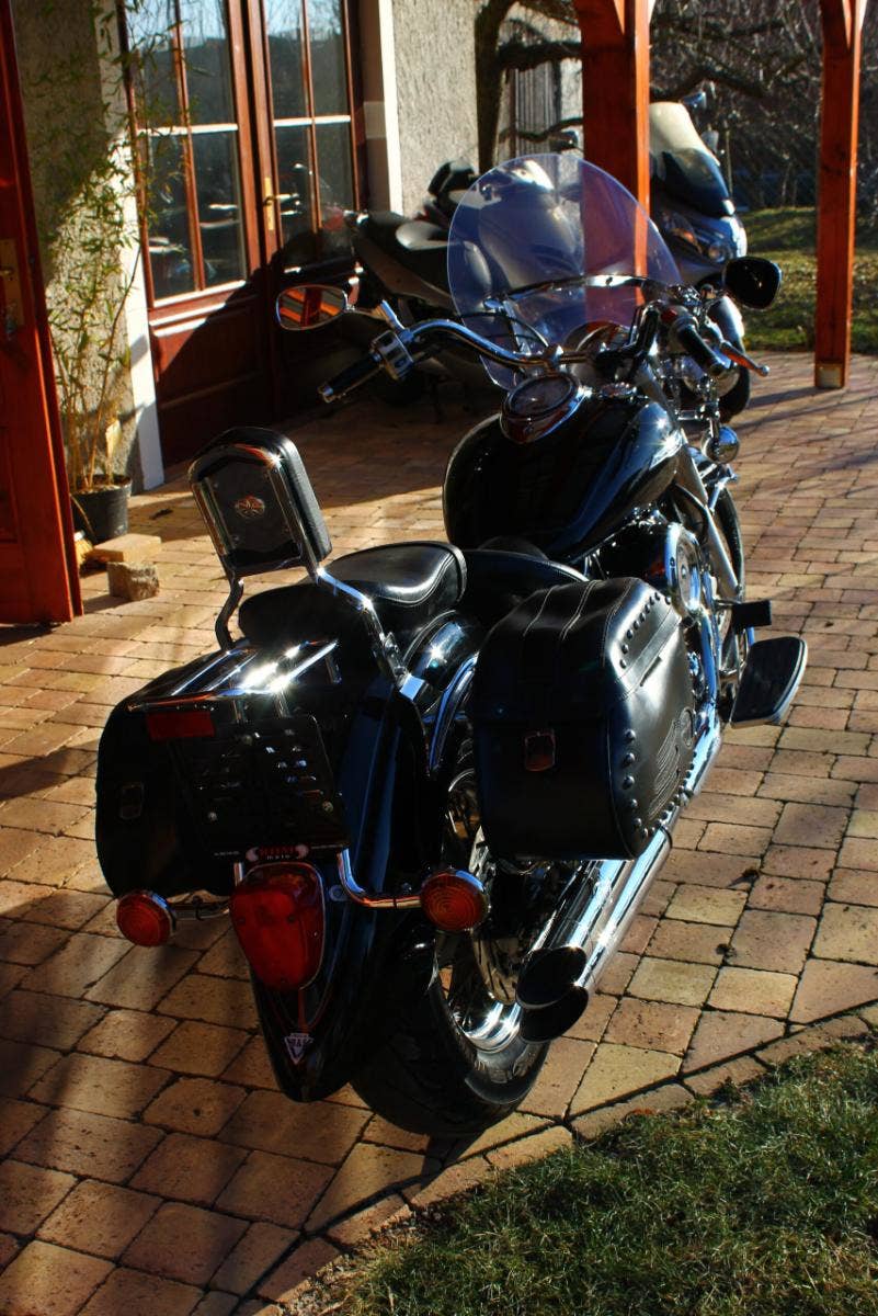 Motocykl se spoustou doplňků - plexi štít, přídavná světla, padací rám, brašny, nosič, opěrka, rámeček blatníku, zásuvka 12V, laděné výfuky s homologací.