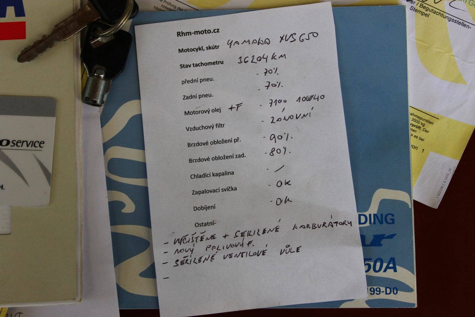 Po servisní kontrole - nové oleje, filtry, vyčištěné a seřízené karburátory, seřízené ventilové vůle, po kontrole brzd, dobíjení, atd….