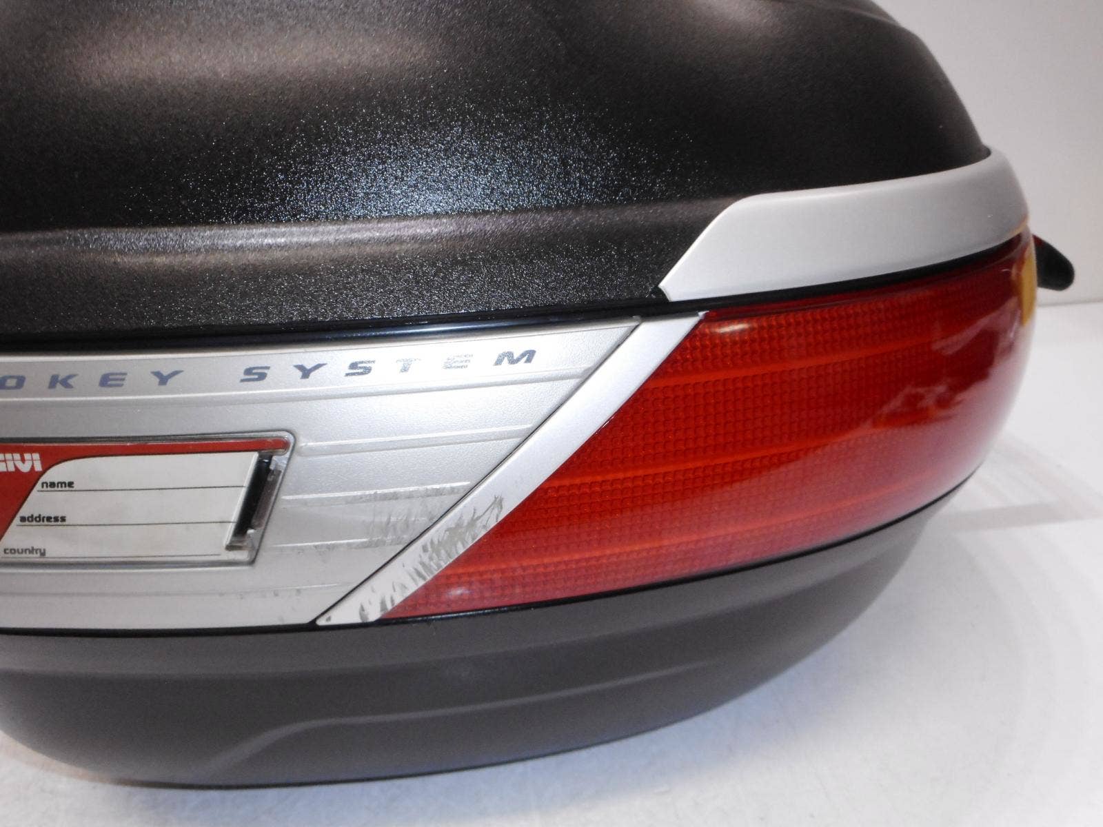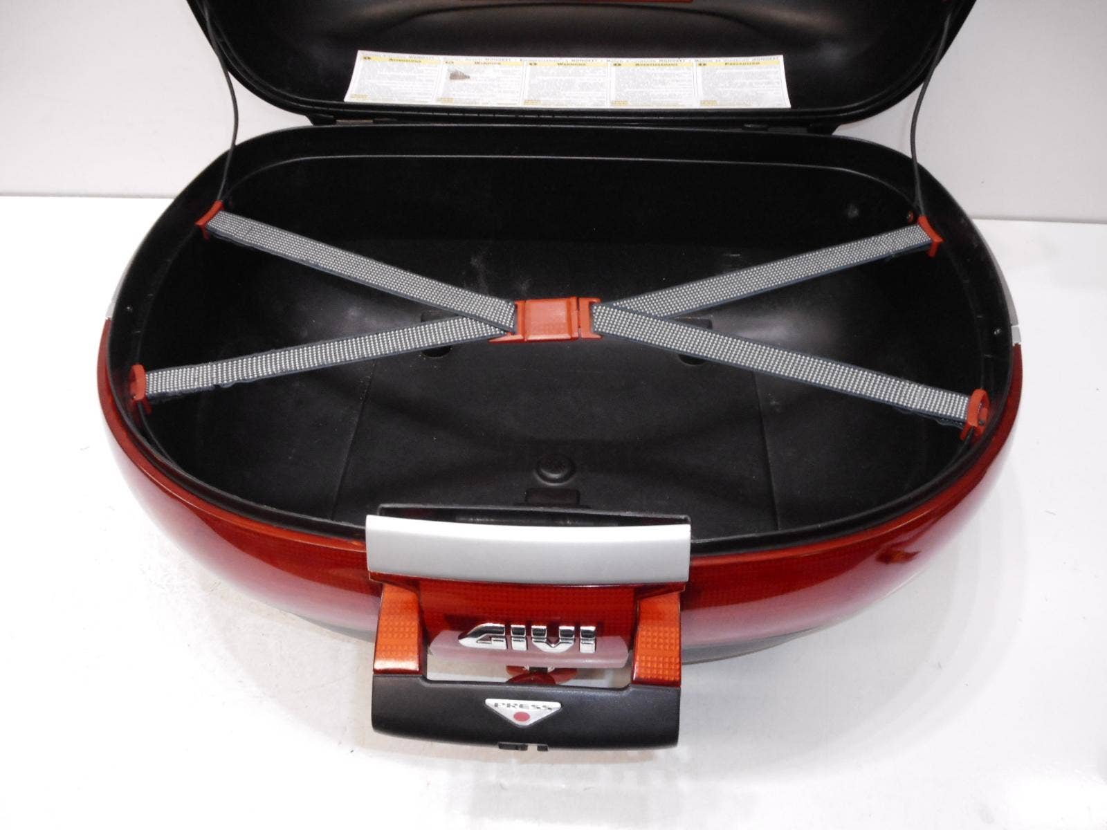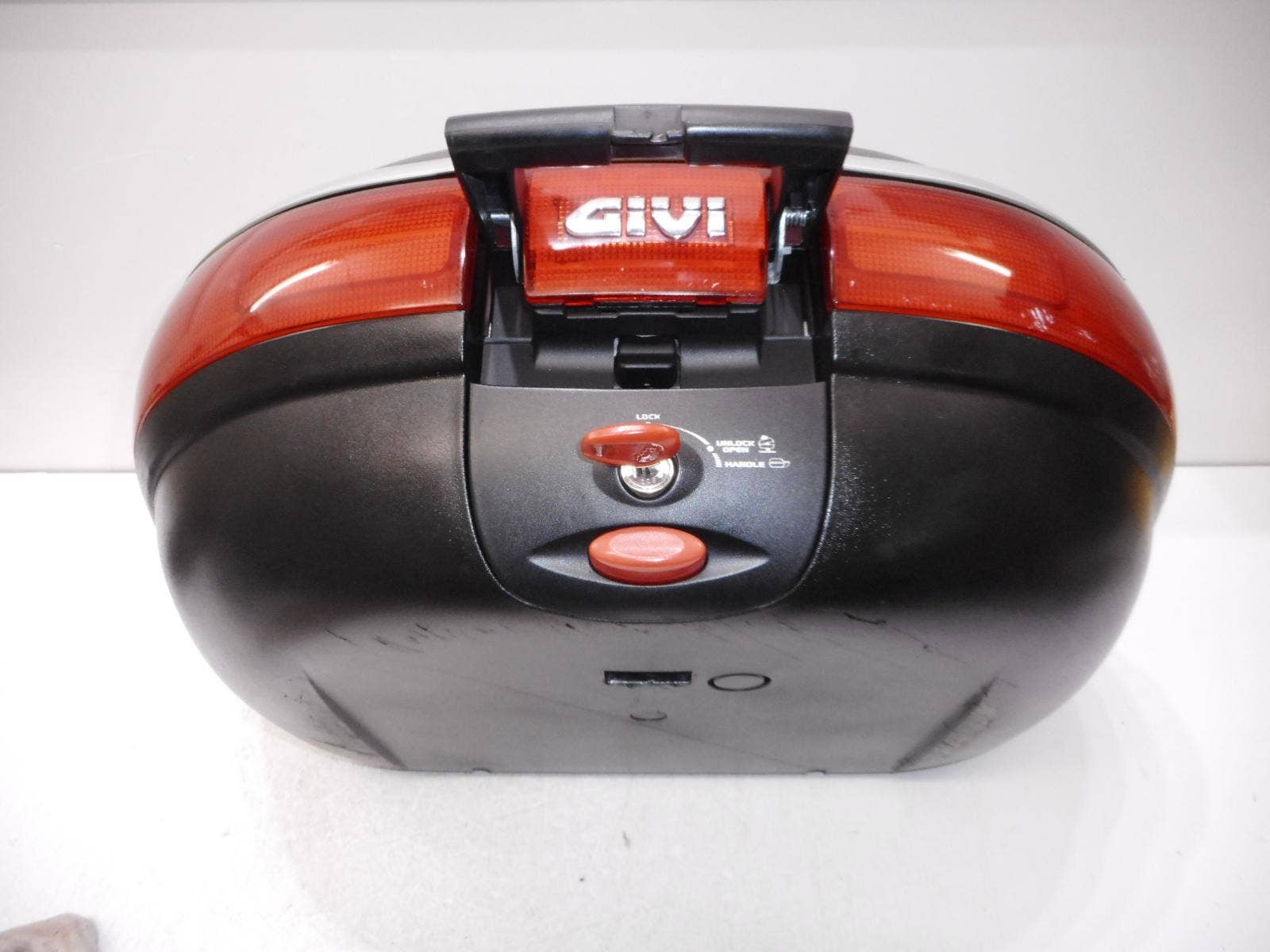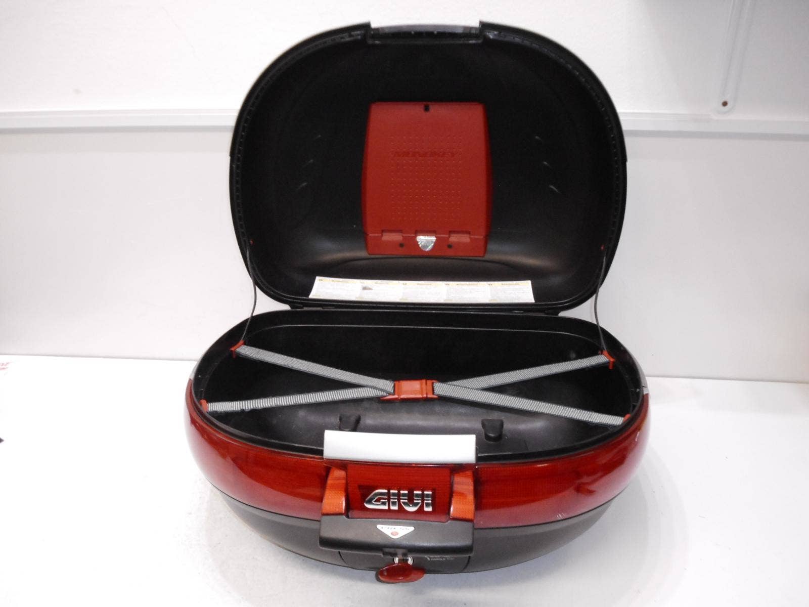 Veškeré zamykání, otevírání a systém uchycení je v pořádku. Povrch má místy oděrky (viz. foto). Velmi kvalitní kufr od prověřené italské značky GiVi pro všechny, kteří potřebují uložný prostor navíc. Díky zadním odrazným částem v červeném provedení budete v noci ještě lépe vidět. Kufr má objem 52l a nosnotst 10kg. Do kufru se vejdou dvě zavřené helmy.