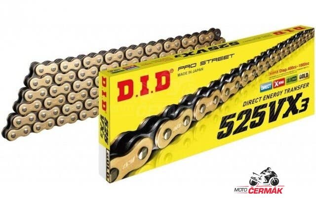 D.I.D. 525VX3 - základní vylepšený těsněný DID řetěz s těsnícím "X" kroužkem, pokračovatel řetězu DID 525VX.